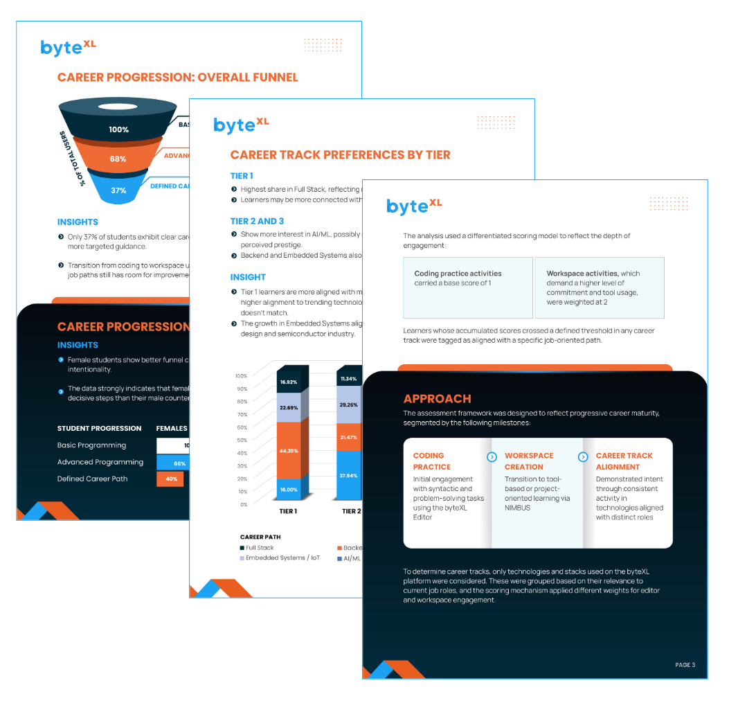 The byteXL AI & Engineering Jobs Report 2025 presents a first-of-its-kind behavioural study of over 1,00,000+ engineering students across India. It uncovers how students progress from foundational programming to aligning towards a defined career path, based on data from the byteXL platform.
